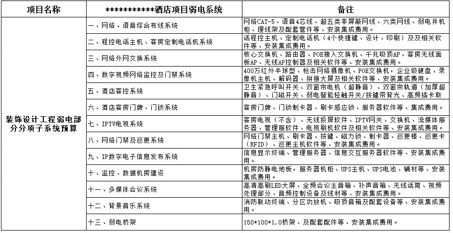 本设计中弱电系统主要有:1、网络、语言综合布线系统:2、程控电话主机、客房定制电话机系统:3、网络外网交换系统:4、数字视频网络监控及门禁系统:5、酒店客控系统:6、酒店客房门牌、门锁系统:7、IPTV电视系统:8、网络门禁及巡更系统:9、IP数字电子信息发布系统:10、监控、数据机房建设:11、多媒体会议系统:12、背景音乐系统:13、弱电桥架。